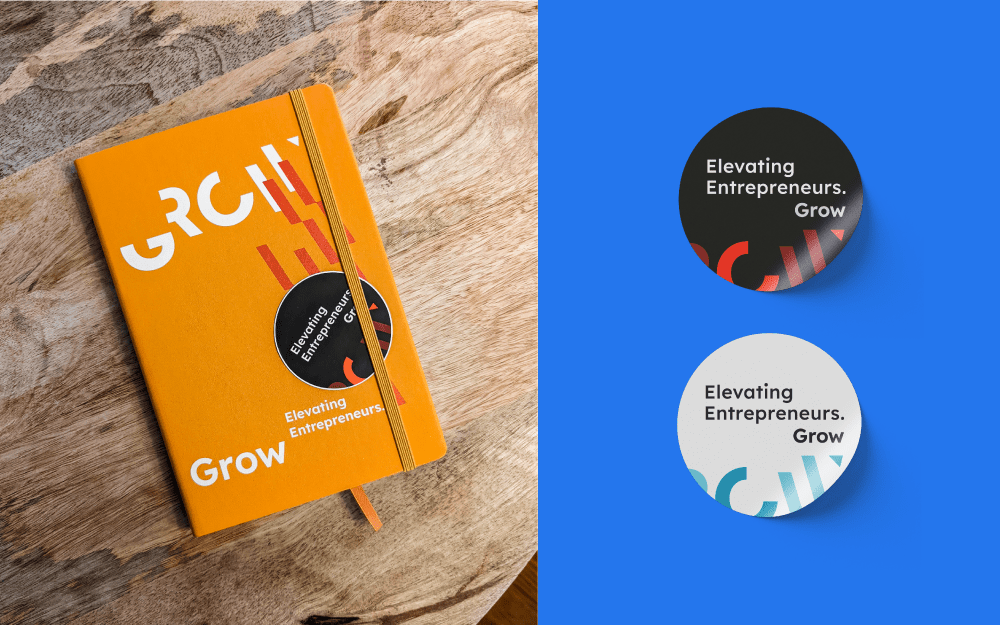To move from catering exclusively to women entrepreneurs to a more inclusive brand, Grow sought a refreshed identity. Our team provided a new tagline, revamped messaging, and developed physical touchpoints for their entrepreneurs and board. These updates reflect the data-driven nature of their approach to help all individuals thrive and grow in their businesses, with movements and pivots resembling pie charts and graphs.